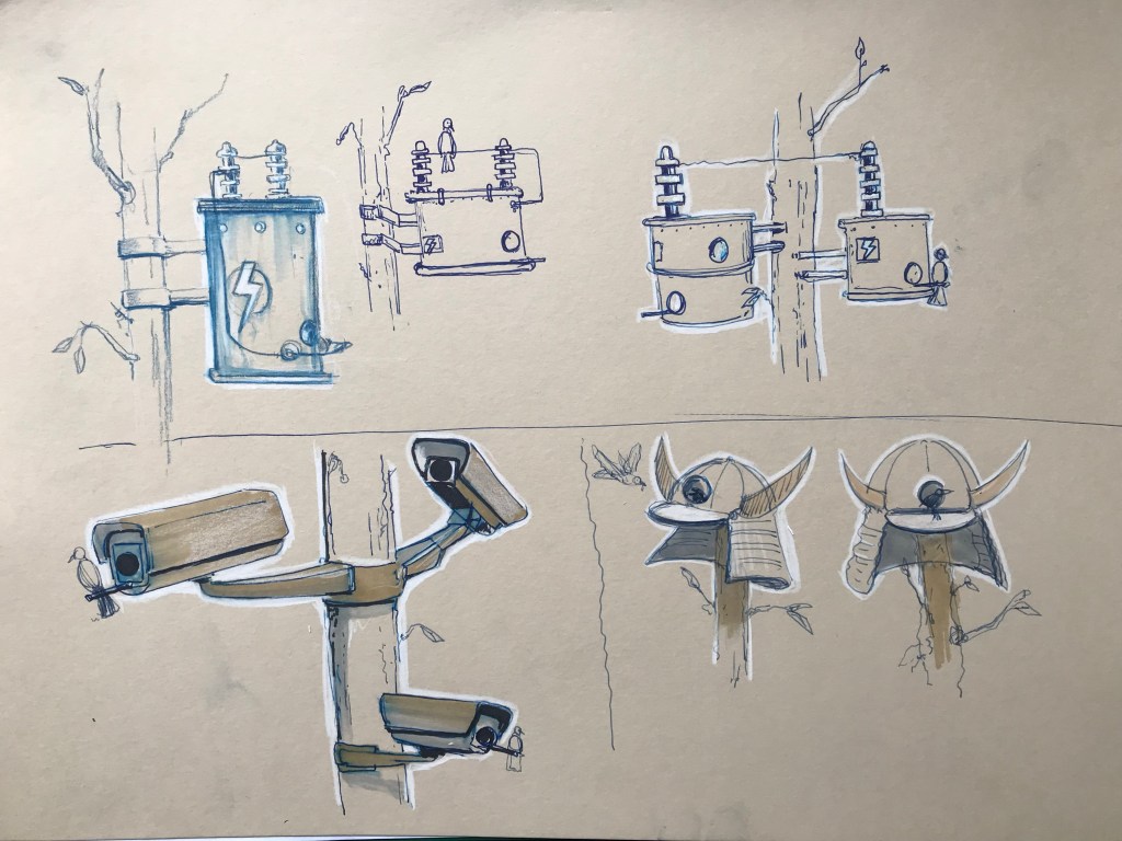 Une recherche de concepts pour des cabanes à oiseaux. Entres les transformateurs électriques de mon enfance au Québec et au USA, les caméras de surveillances (Nice to meet you – titre) et le casque de samouraï (parce que j’adore le Japon et l’époque EDO. J’imagine bien des oiseaux s’y nicher le temps d’un été pour fonder la famille.
