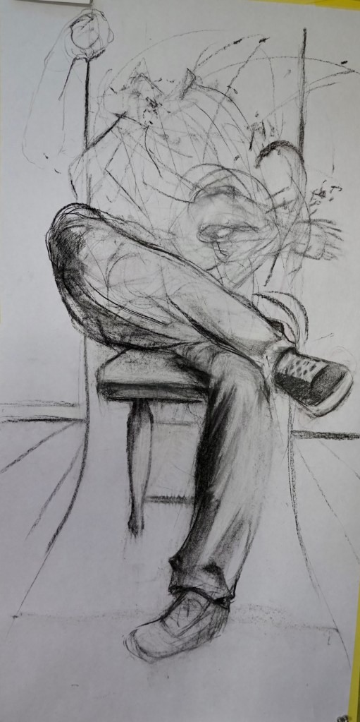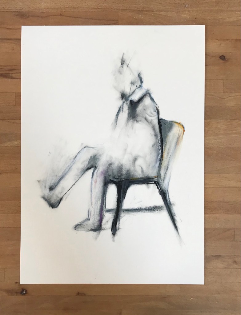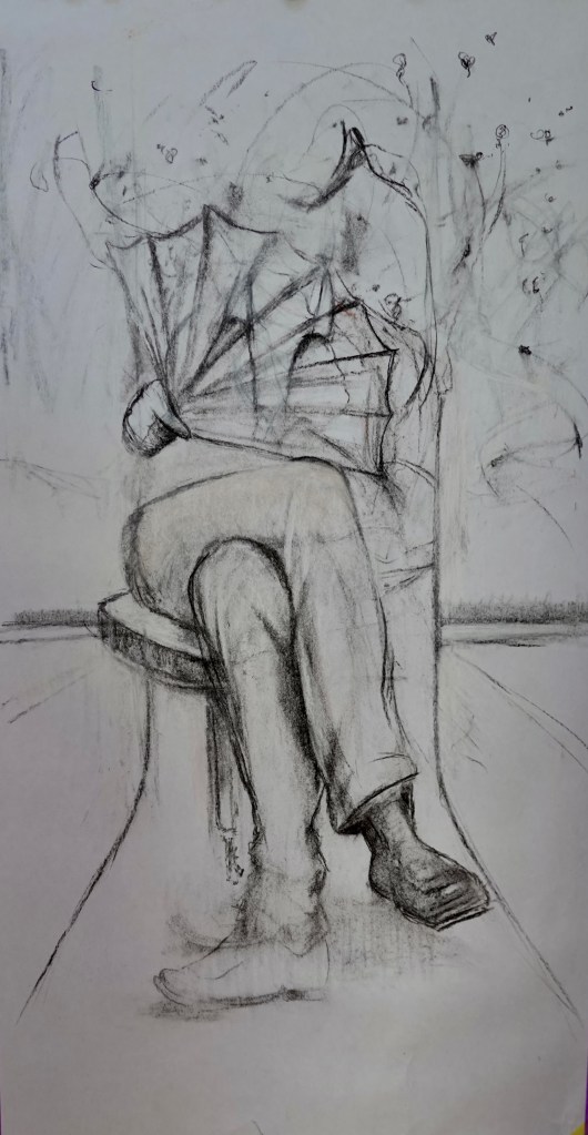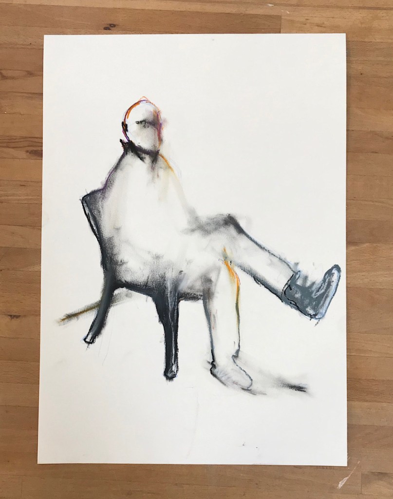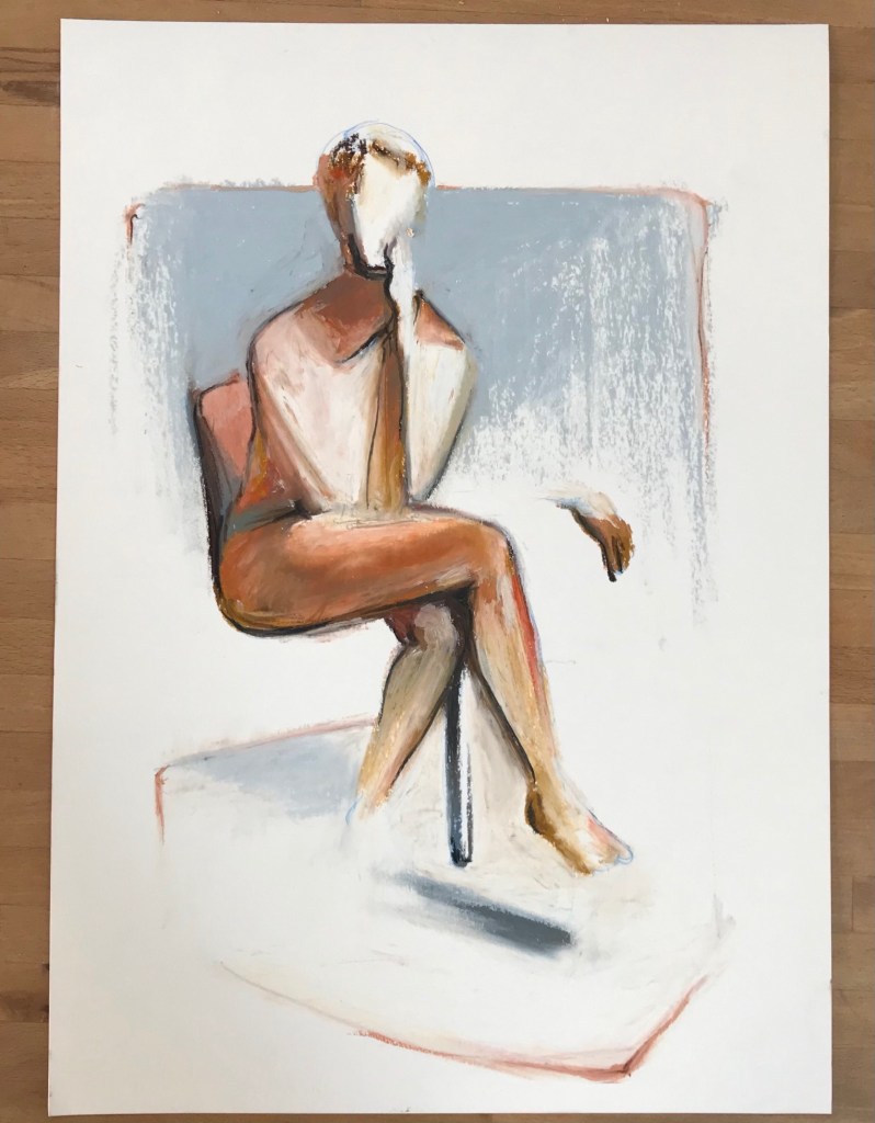 A partir de personnages assis en réflexion, en attente… Prendre le temps de regarder à l’intérieur comme à l’extérieur.