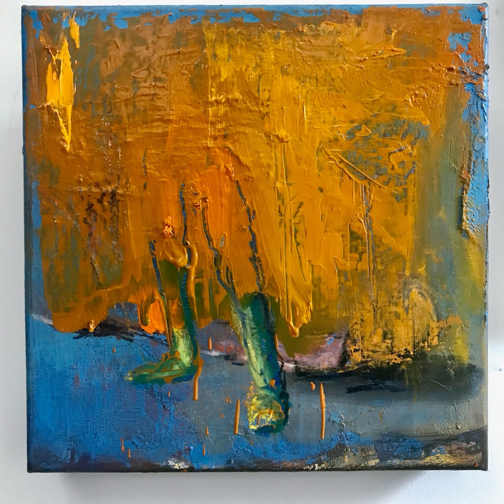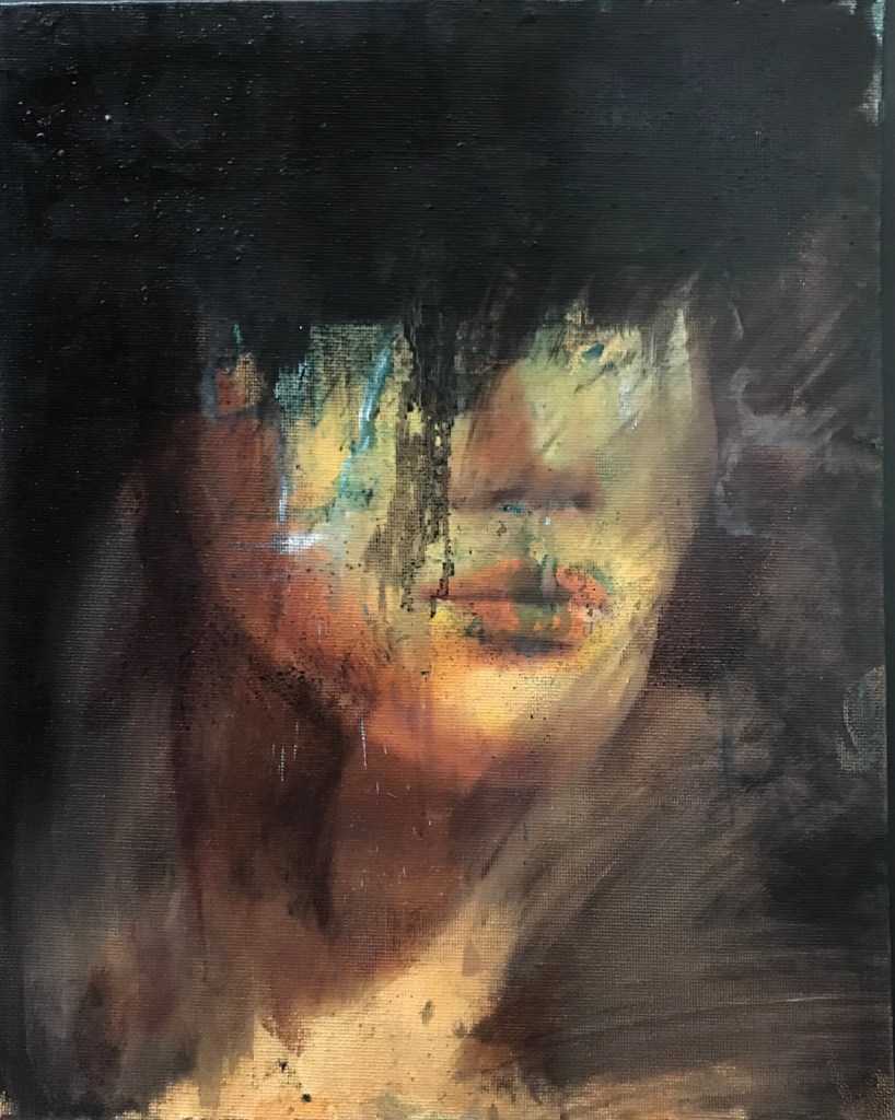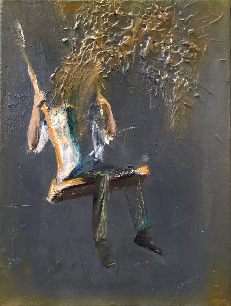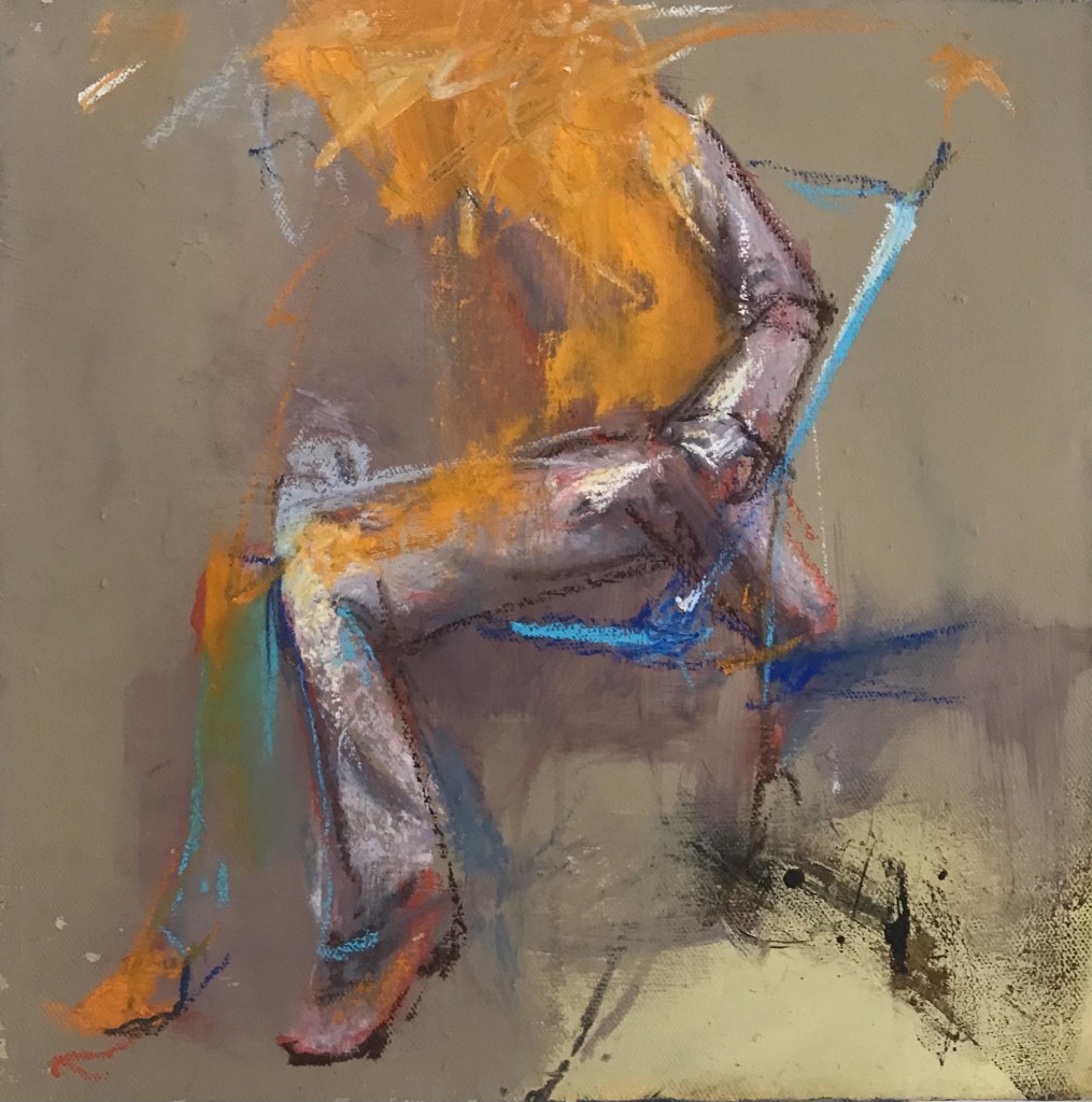 Sit and wait – Oil, pastel on canvas 40 x 40 cmStanding and waiting – Oil, pastel on canvas 40 x 40 cmSwing and wait – Oil, pastel on canvas 40 x 50 cmShtt -Watercolour – gouache on sandpaperBreathe – Oil on canvas 60 x 60 cm.Sereine – Oil on cardboard 20 x 30 cm.Wait – Pastel on paper