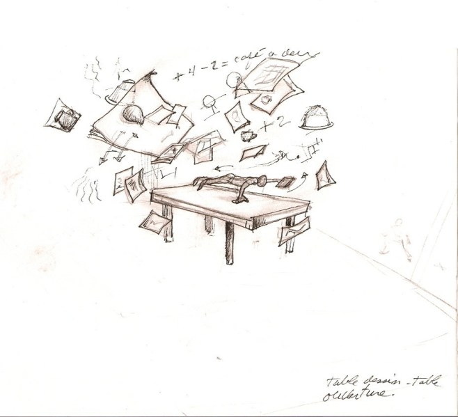« L’architecte » dessin pour scénographie avec acrobate sur table