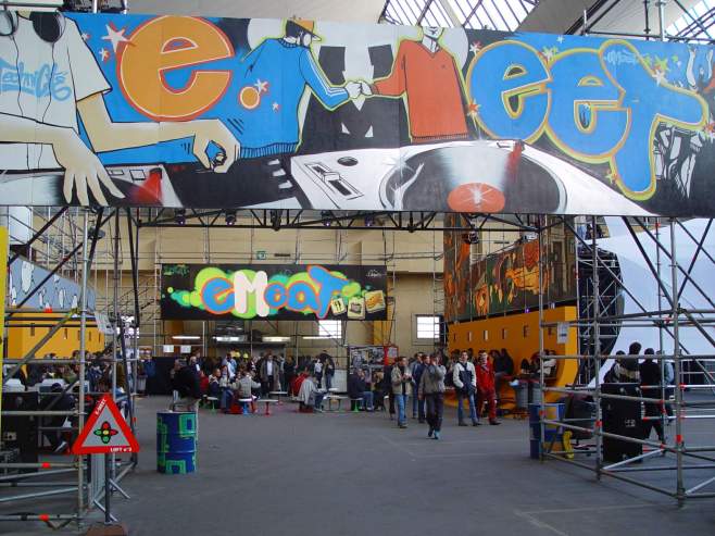 Entré pour restaurant – échafaudages avec Graffitis et DJ au dessus